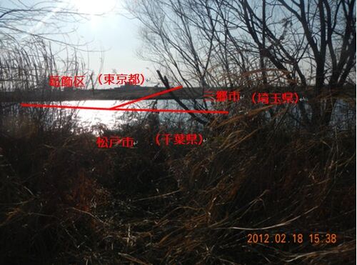 先ほどの葛飾区最東端の写真を撮影した地点から草叢をかき分けて川沿いの道に戻り、わずか50メートルほど北に歩くと葛飾区三郷市松戸市接点に達します。正確には接点は江戸川の中にあるので接点を眺めるのに一番近い陸地の地点に達したということになります…