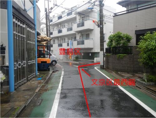 濁流の神田川 東京に唯一残った路面電車の都電荒川線、面影橋駅から神田川を横切って北東方向に7〜8分ほど歩くと文京区最西端に到着します。当日の神田川は折からの雨で濁流と化していました。住宅街の路地の三叉路(十字路ではない)が、三区接点だったり最西…