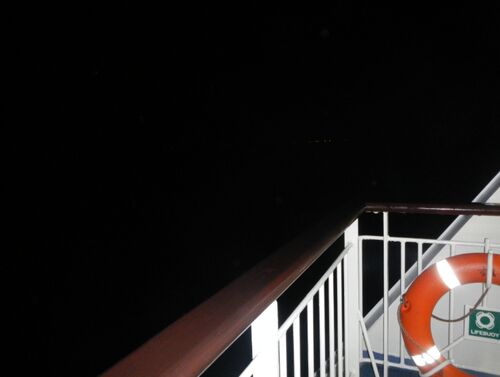 苫小牧港(前日)23:30→新日本海フェリー→20:30敦賀港 18:00頃、映画を見終わって甲板に出てみると、写真ではほとんどわかりません(わかる人は相当、眼がいいと思います)が真っ暗な海のはるか遠くに町の灯が見えました。フロントのディスプレイで見ると福井…